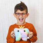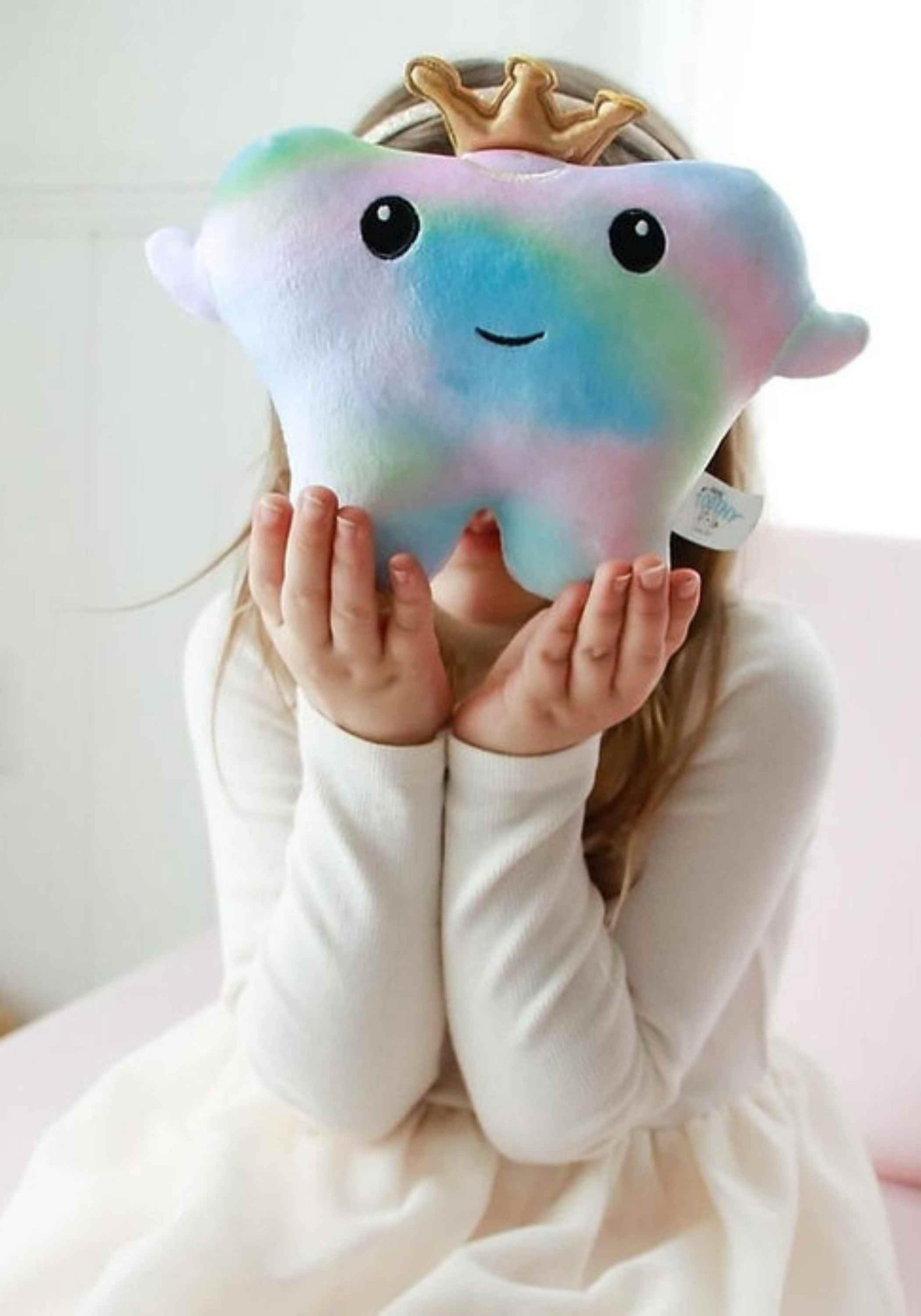 Yup, that’s me, in full multicolor plush! I’m soft, snuggly, and I’ve got a secret pocket in my wings so the Tooth Fairy can swoop in without waking anyone up.